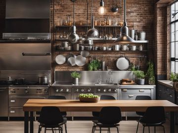Utilitarian design, exposed brick, metal surfaces, and the use of industrial-style lighting fixtures.