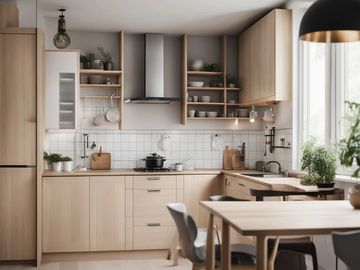 Minimalistic design, light colors, natural wood elements, and an emphasis on functionality.